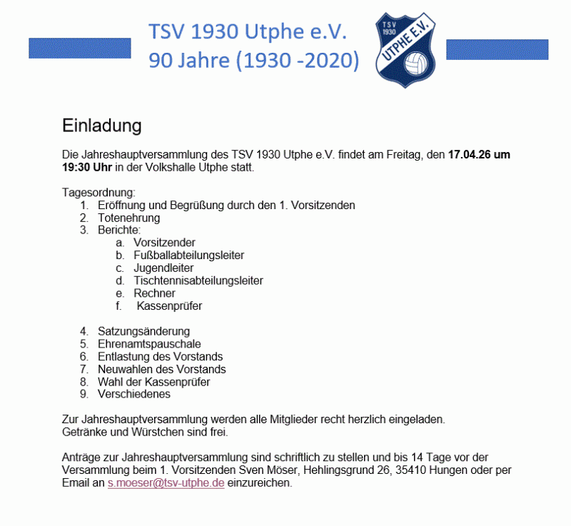 Anträge zur Jahreshauptversammlung sind schriftlich zu stellen und bis 10 Tage vor der Versammlung beim 1. Vorsitzenden Sven Möser, Hehlingsgrund 26, 35410 Hungen oder per Email an s.moeser@tsv-utphe.de einzureichen.